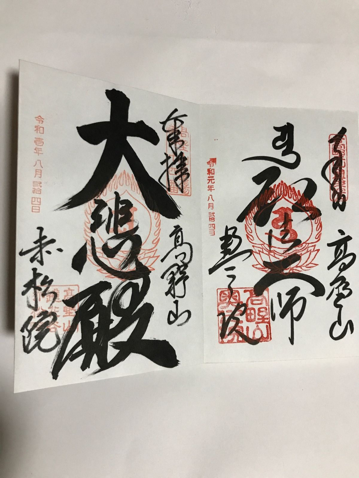 1枚目写真は、壇上伽藍で拝受した御朱印2つ。2枚目写真は、奥之院、泊まった宿坊赤松院の御朱印。